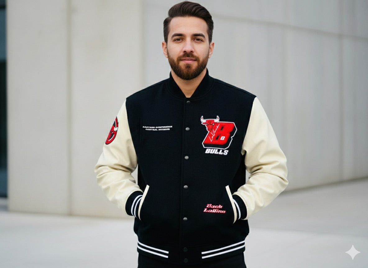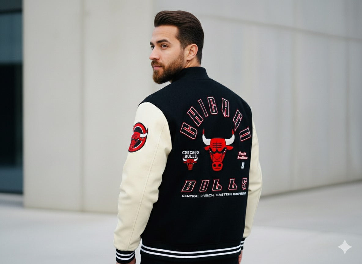 Make a bold statement with this Chicago Bulls varsity jacket, designed for fans who like their streetwear sharp and confident. The jacket features a classic varsity silhouette with a black body and contrasting off-white sleeves, giving it a timeless sports-inspired look.