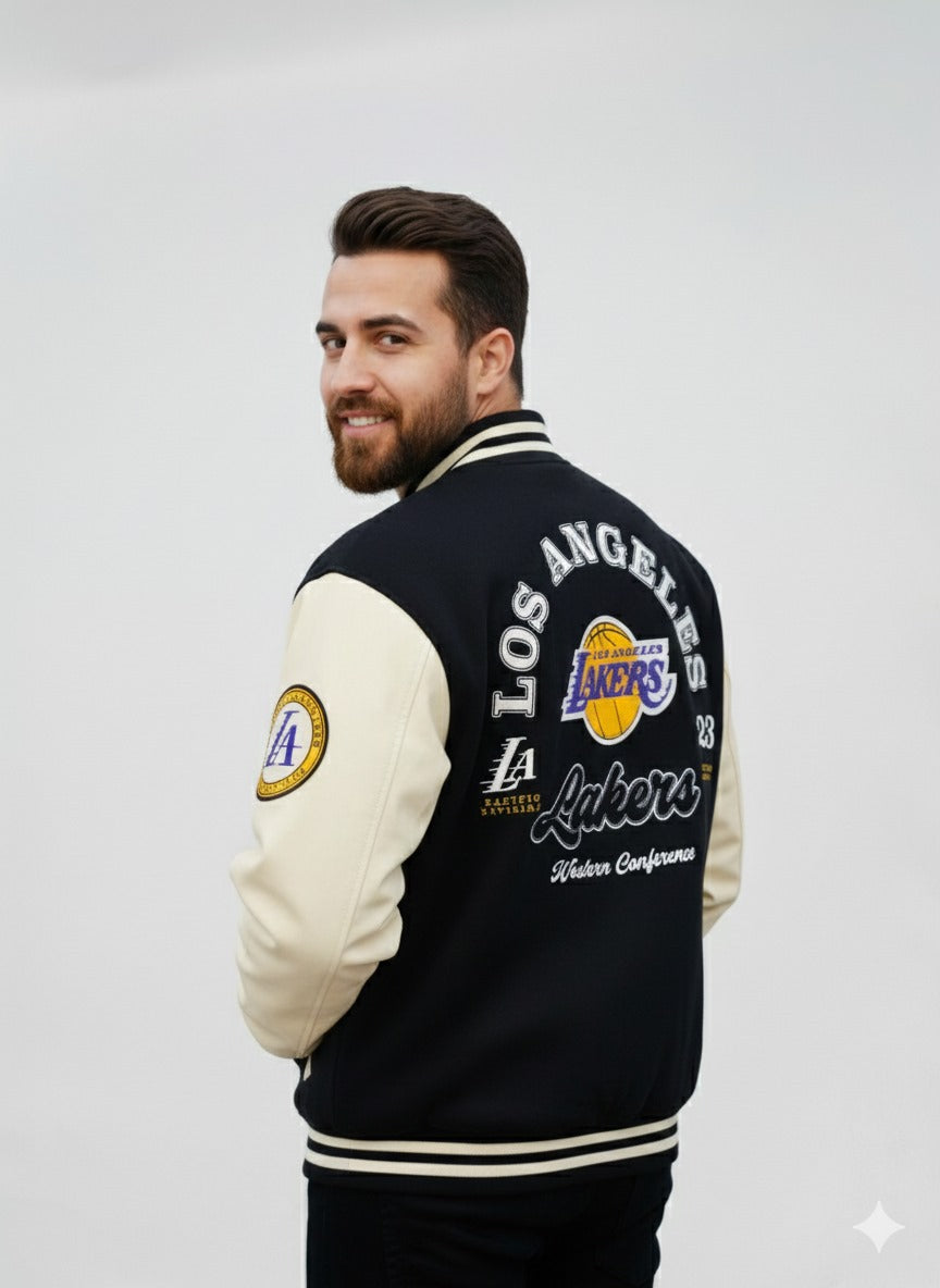 Step up your streetwear game with this Los Angeles Lakers varsity jacket, crafted for fans who appreciate classic sports style with a premium feel. The jacket features a black body paired with contrasting off-white sleeves, creating a clean and timeless varsity look.