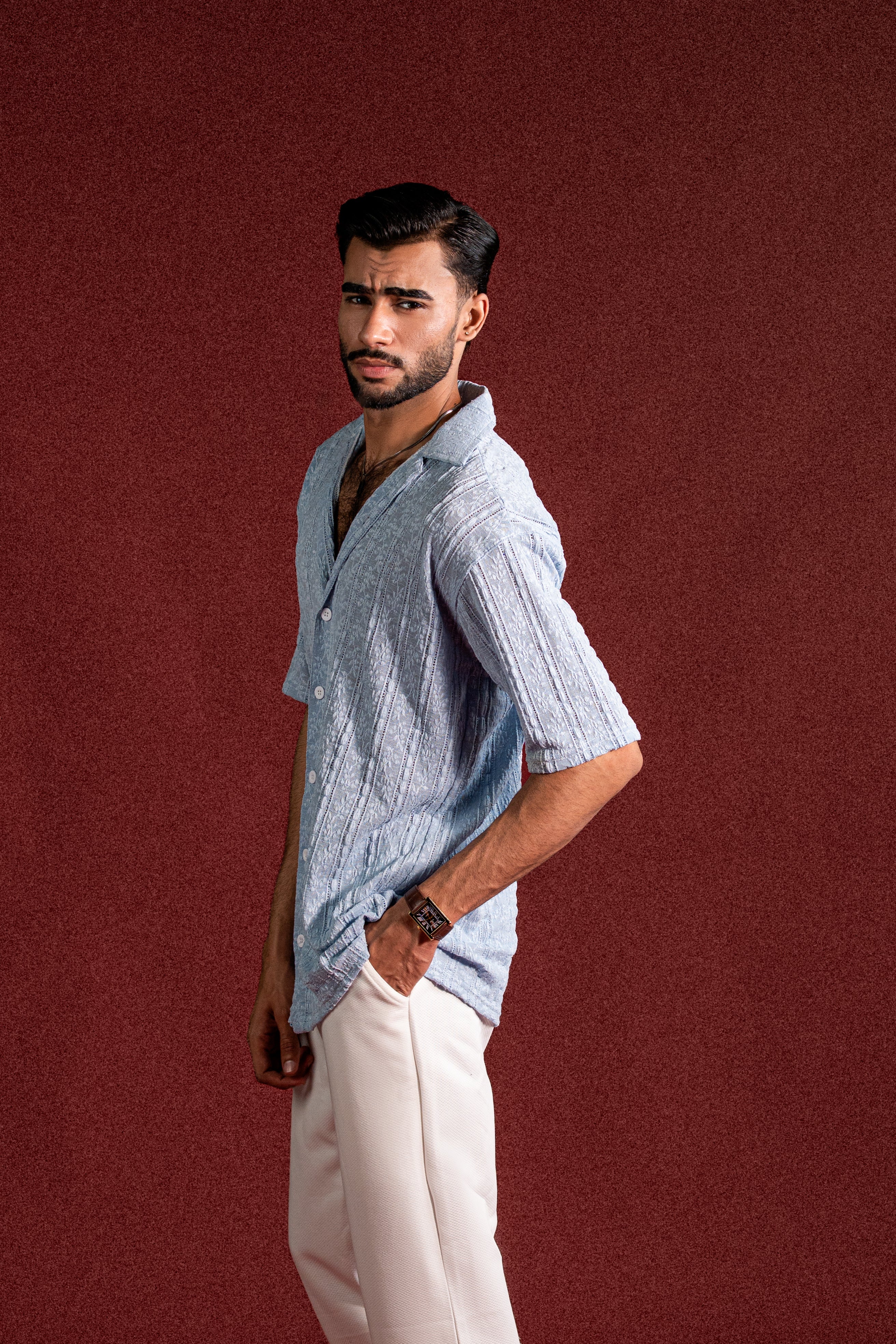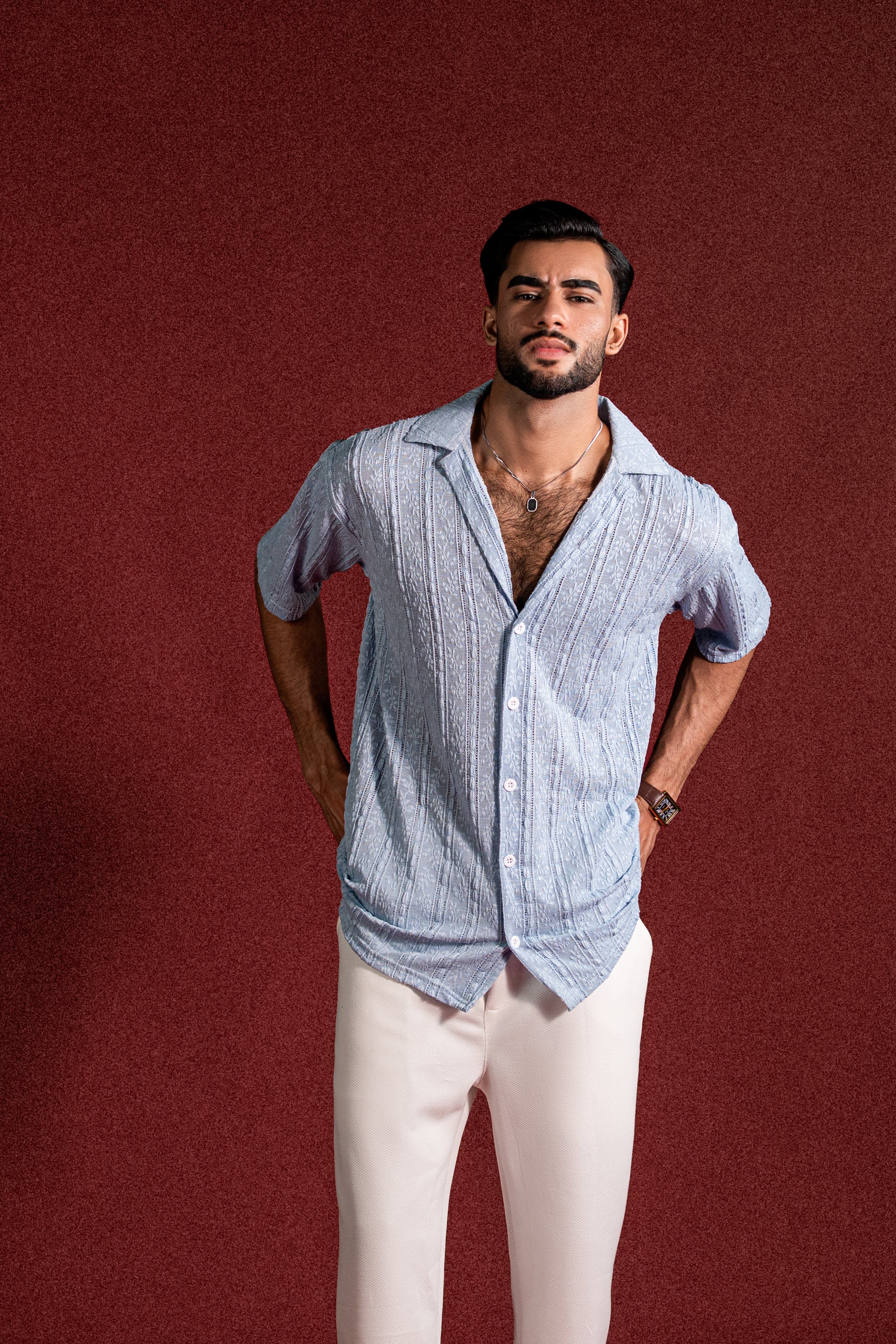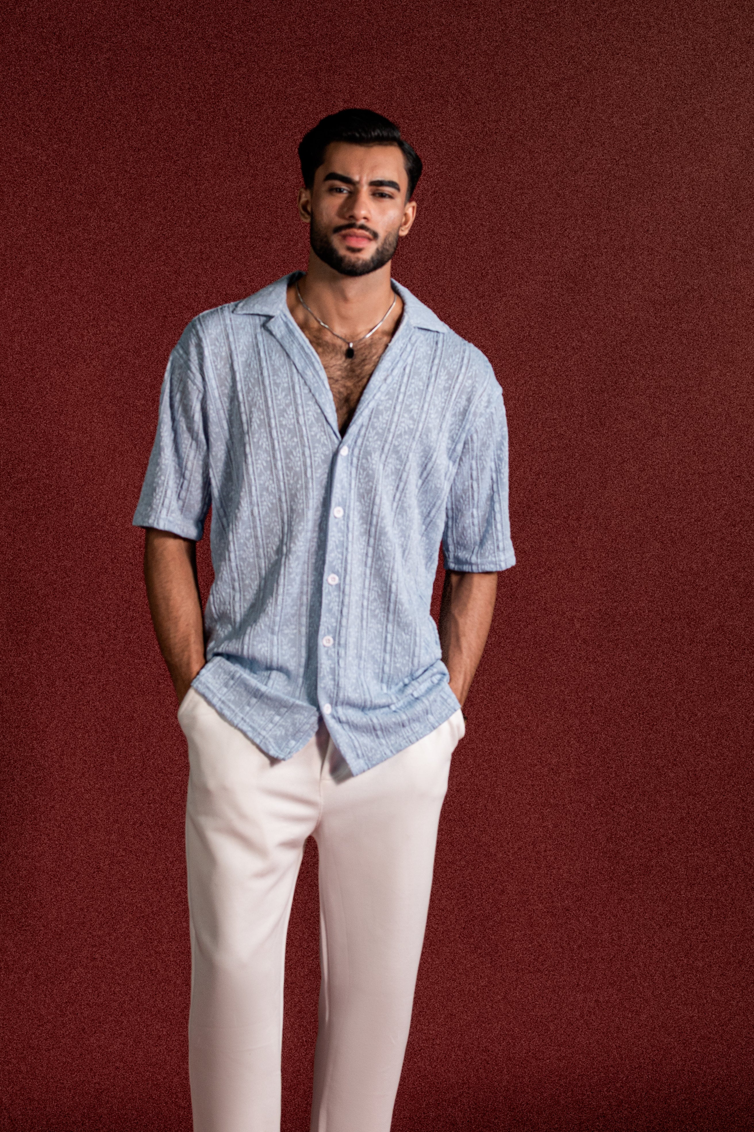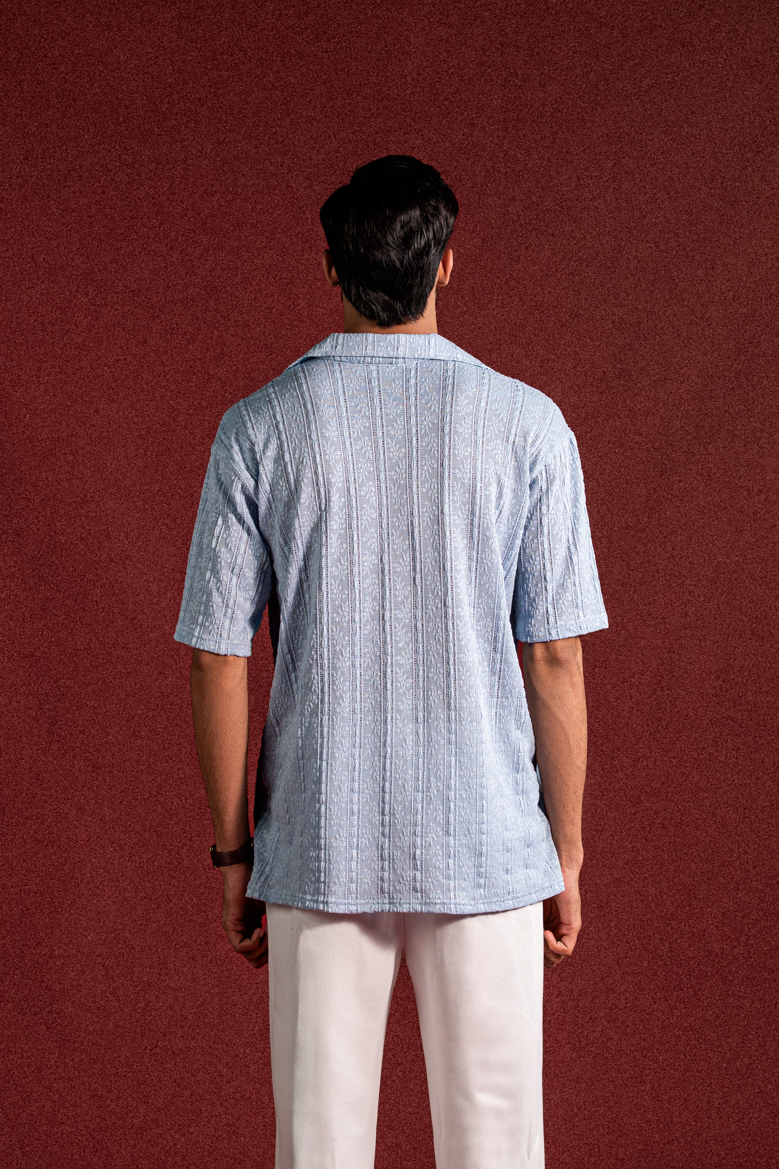 The intersection of tradition and modern leisure. This Ostrich signature shirt features an intricate, open-weave lace pattern that provides unparalleled breathability and a distinct visual character. Cut in a relaxed camp-collar silhouette, this Sky Blue piece is designed for the gentleman who appreciates the finer details of textile craftsmanship.